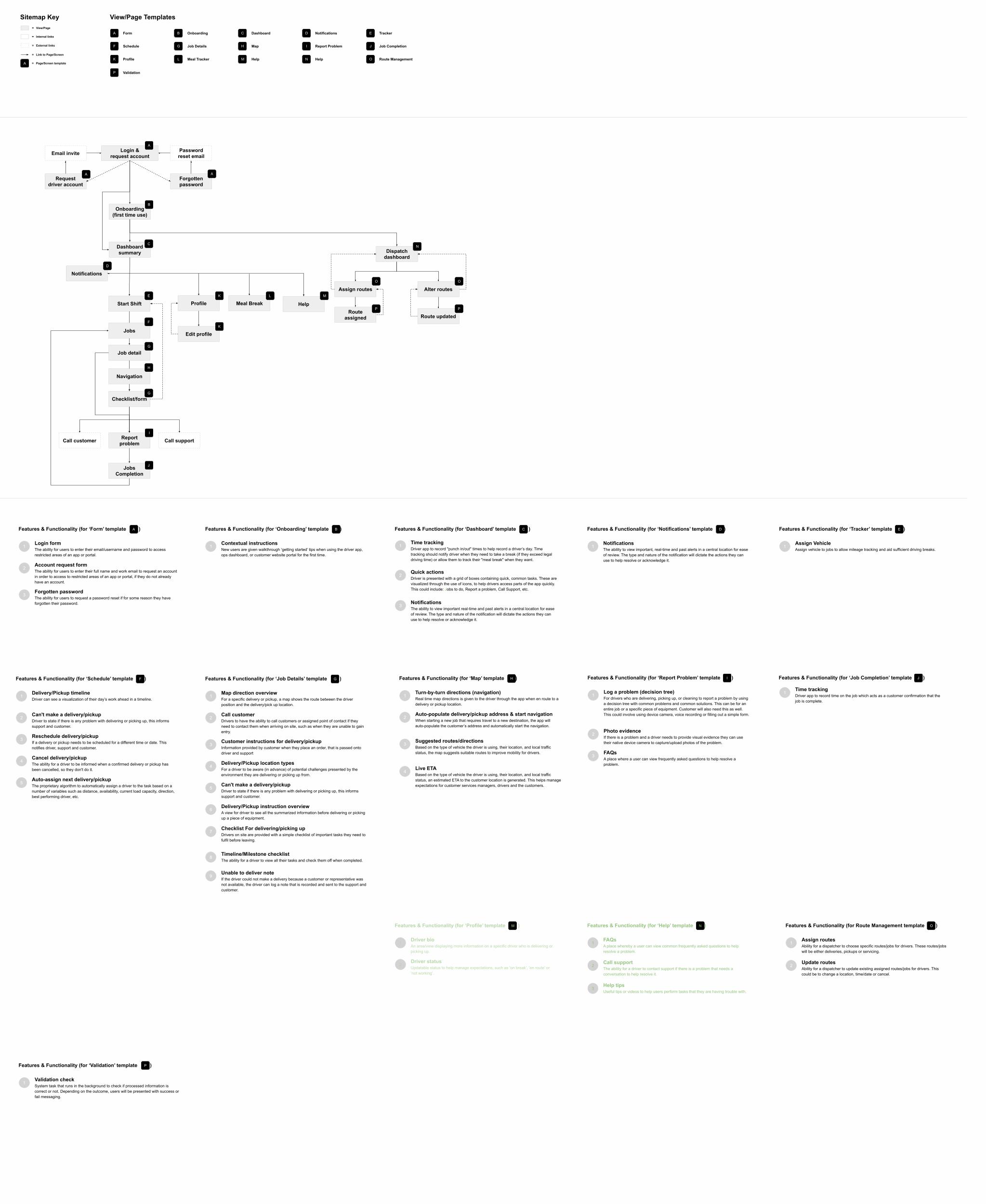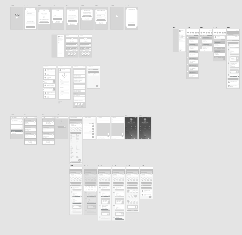 I worked to create a map of the core screens needed for the app to function, along with highlighting each and every feature required for the application to function and grouping them into ‘templates’ for development ease.