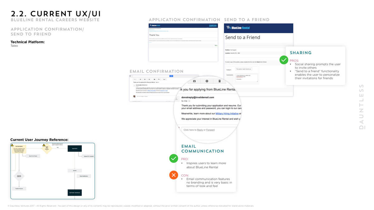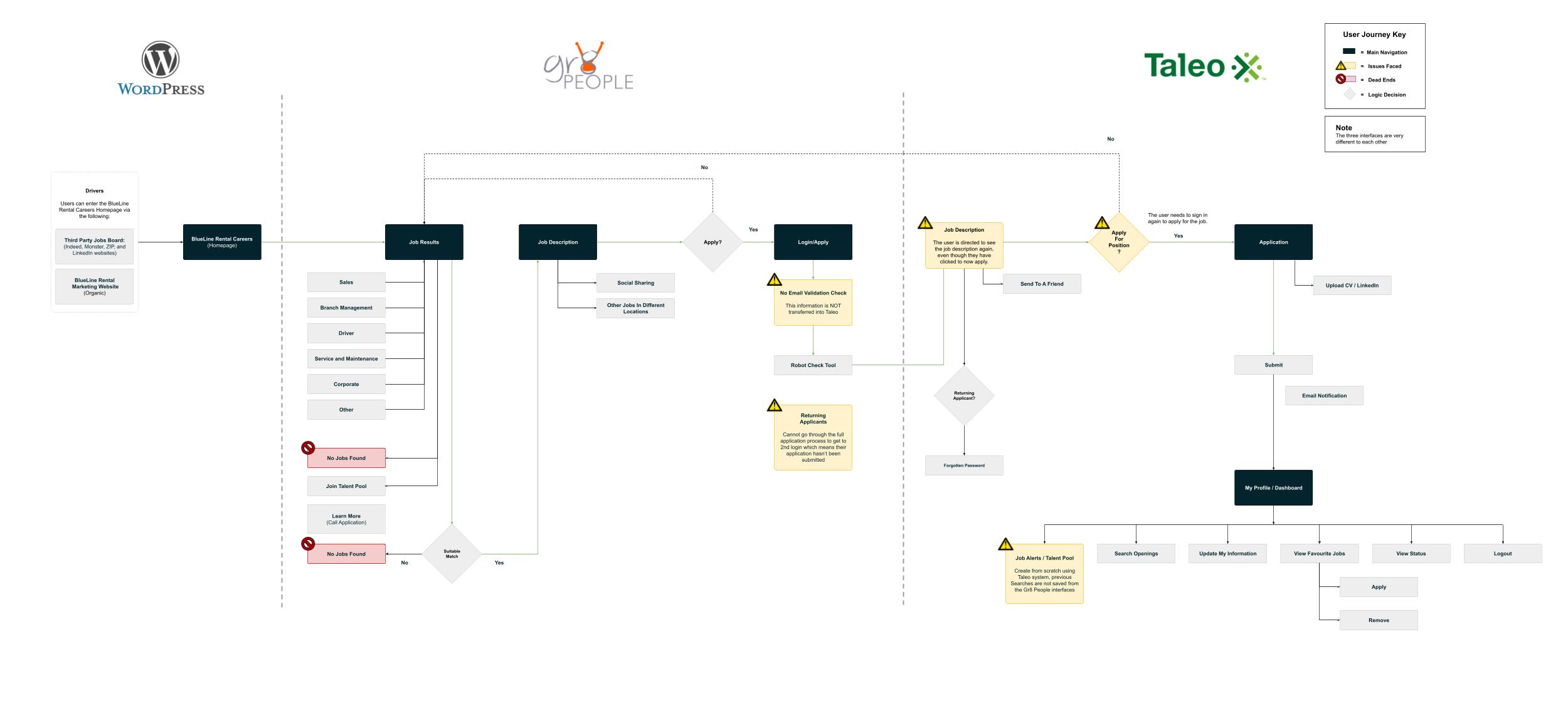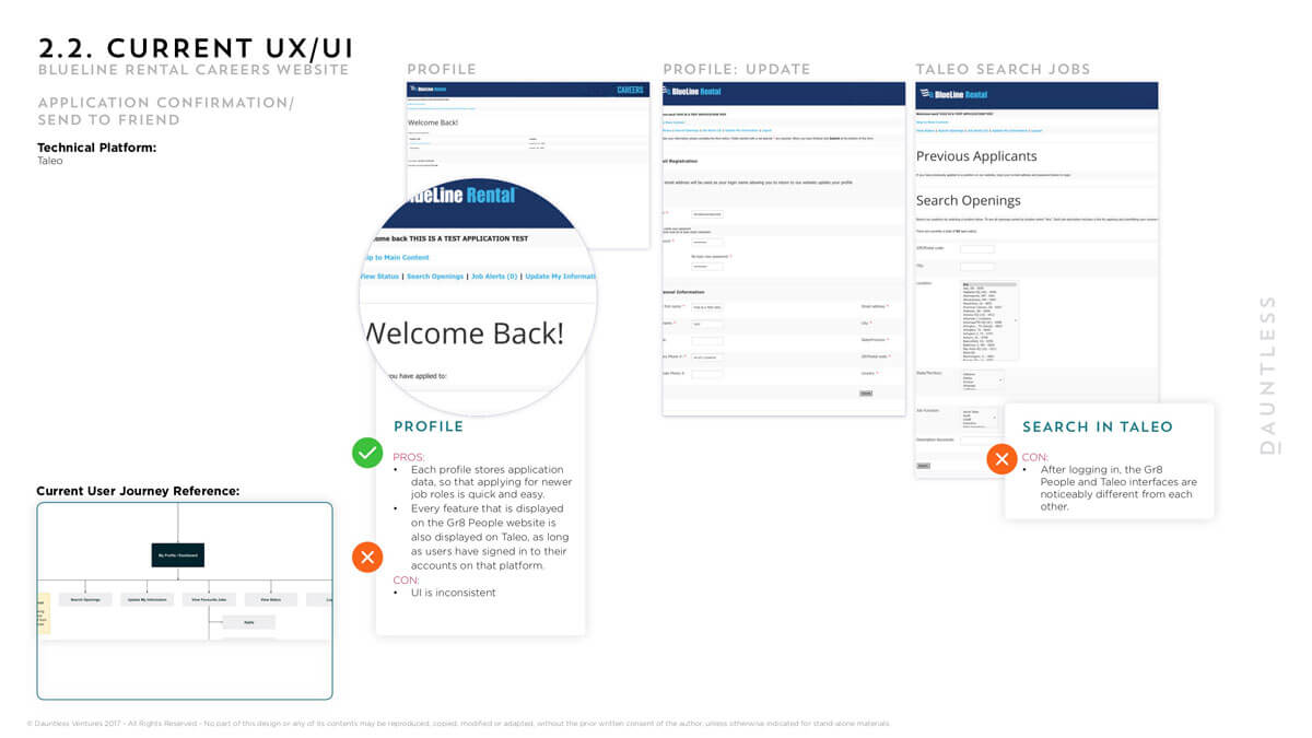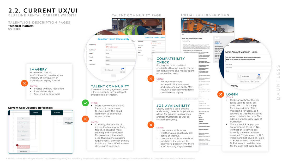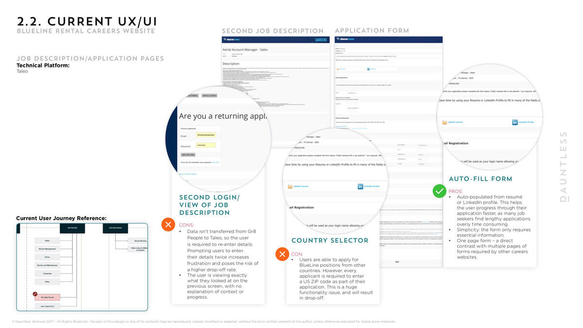 There were three interfaces with which users needed to interact with in order to apply for a job with BLR. After navigating and exploring the site thoroughly I uncovered a wide range of UX and UI issues with the application process.