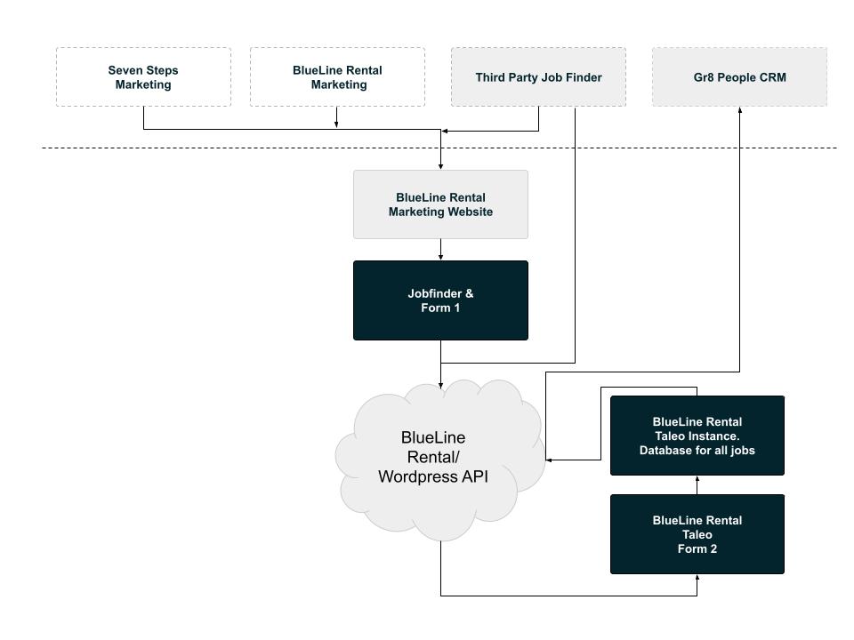 Design, develop and deploy a job finder platform, into the existing WordPress CMS marketing site. Populated with available openings, via a purpose-built API structure from the existing BlueLine Rental presence.