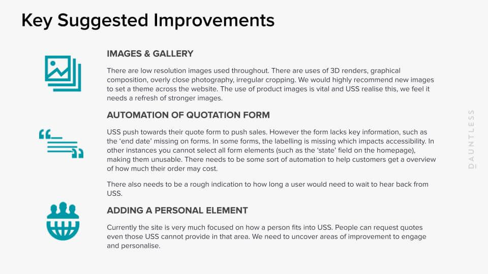 Develop customer type-specific value propositions. We needed to underscore the value of the USS brand, product, & service. It needed to show why USS was better than competitors and list key features.